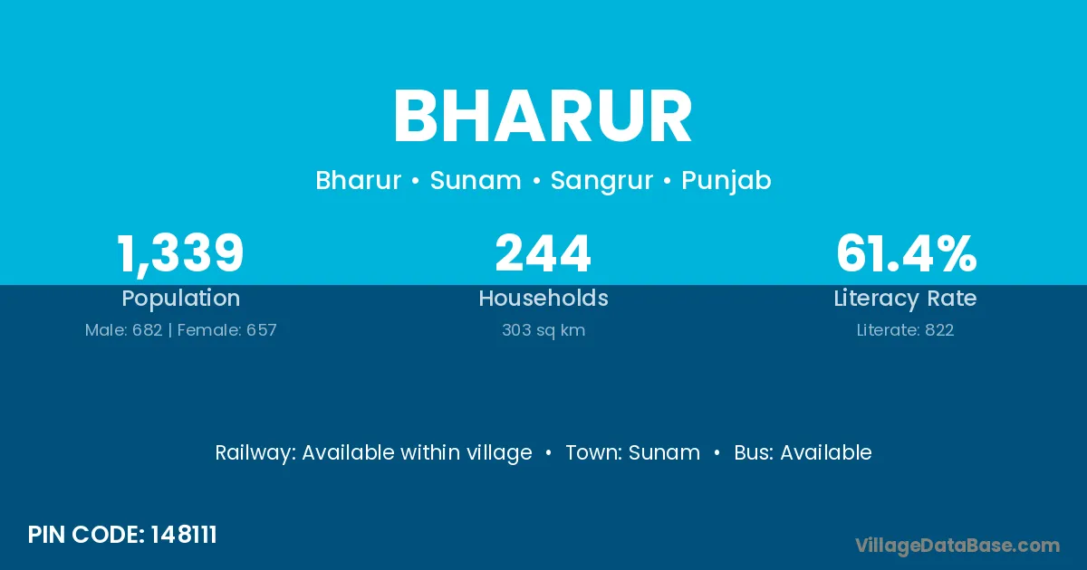 Bharur village has a total population of 1,339 people, of which 682 are males and 657 are females.