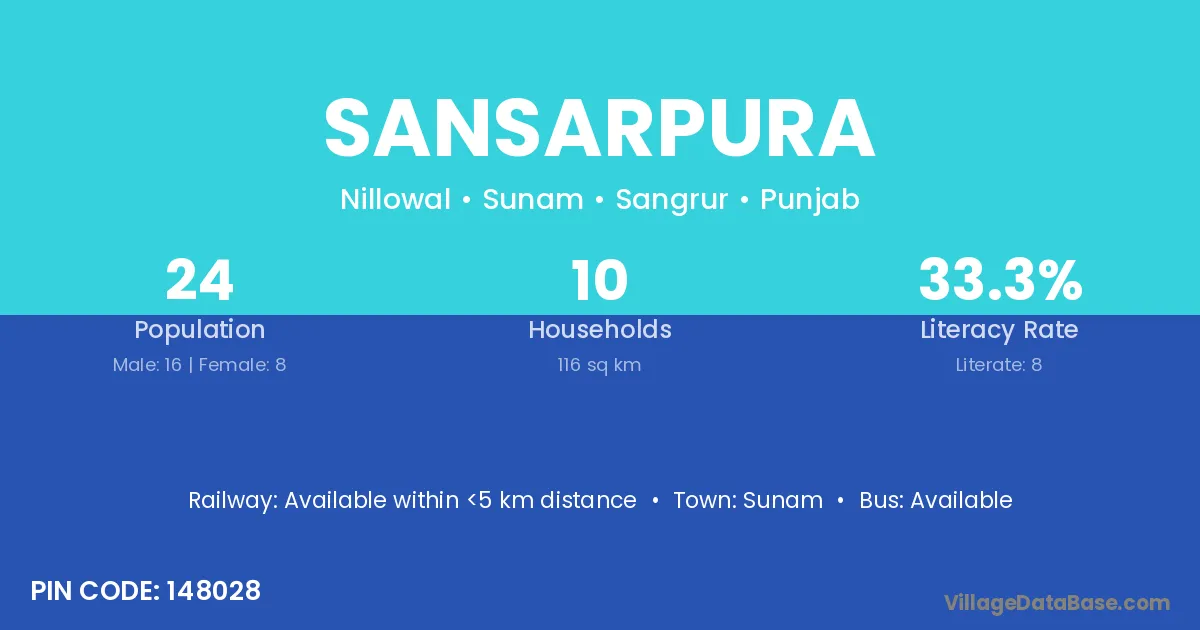 Sunam is the nearest town to Sansarpura village for major economic activities