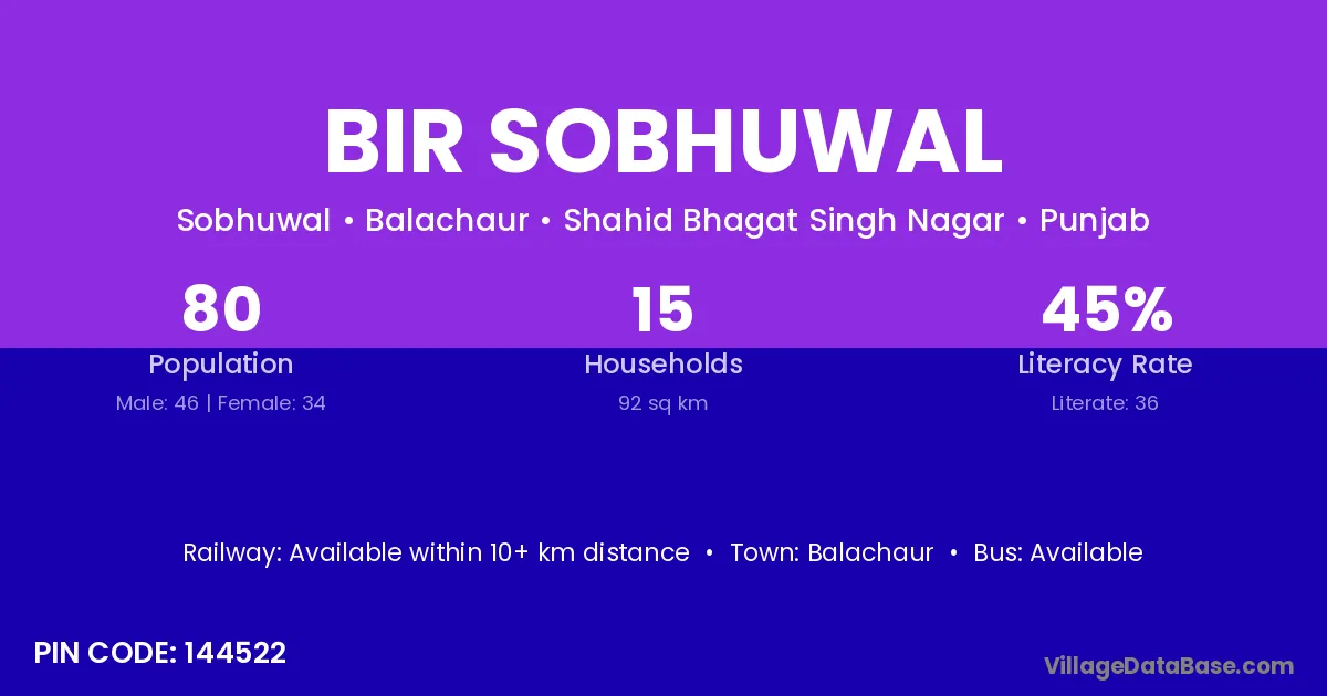 Bir Sobhuwal village has a total population of 80 people, of which 46 are males and 34 are females.