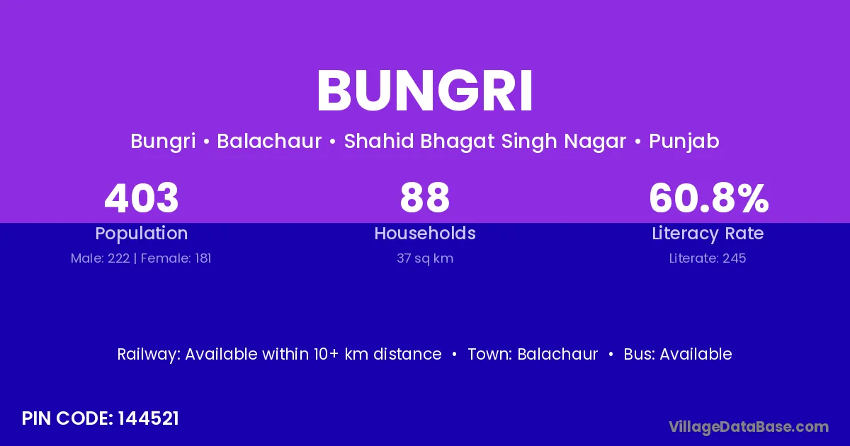 According to Census 2011 information, the village code of Bungri village is 144521.