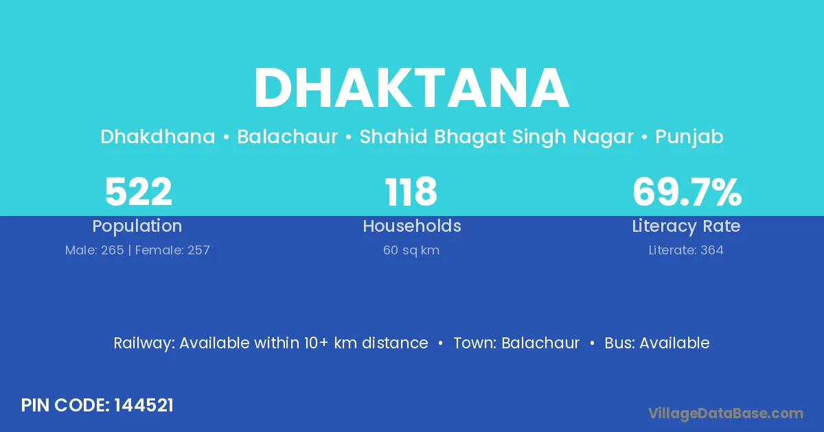 Dhaktana village has a total population of 522 people, of which 265 are males and 257 are females.
