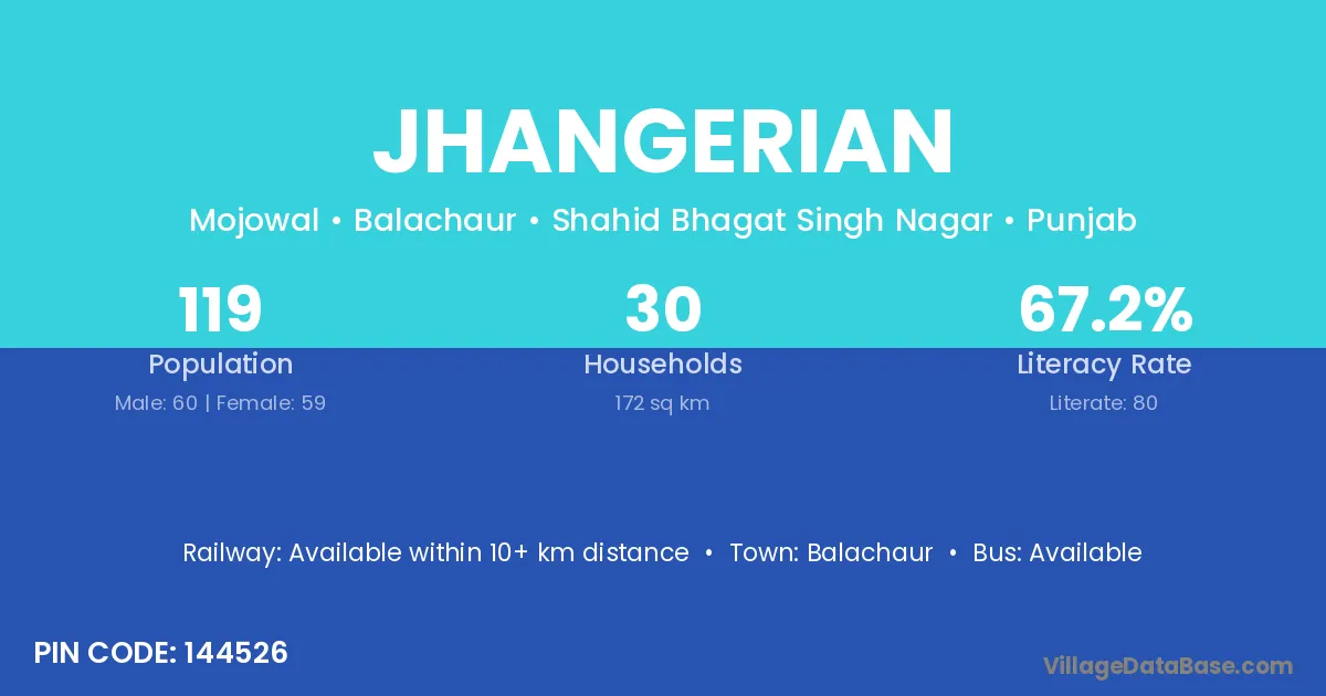 Jhangerian village has a total population of 119 people, of which 60 are males and 59 are females.