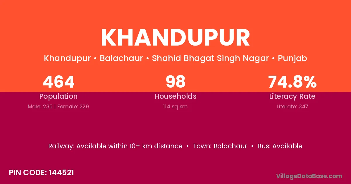 Khandupur village has a total population of 464 people, of which 235 are males and 229 are females.