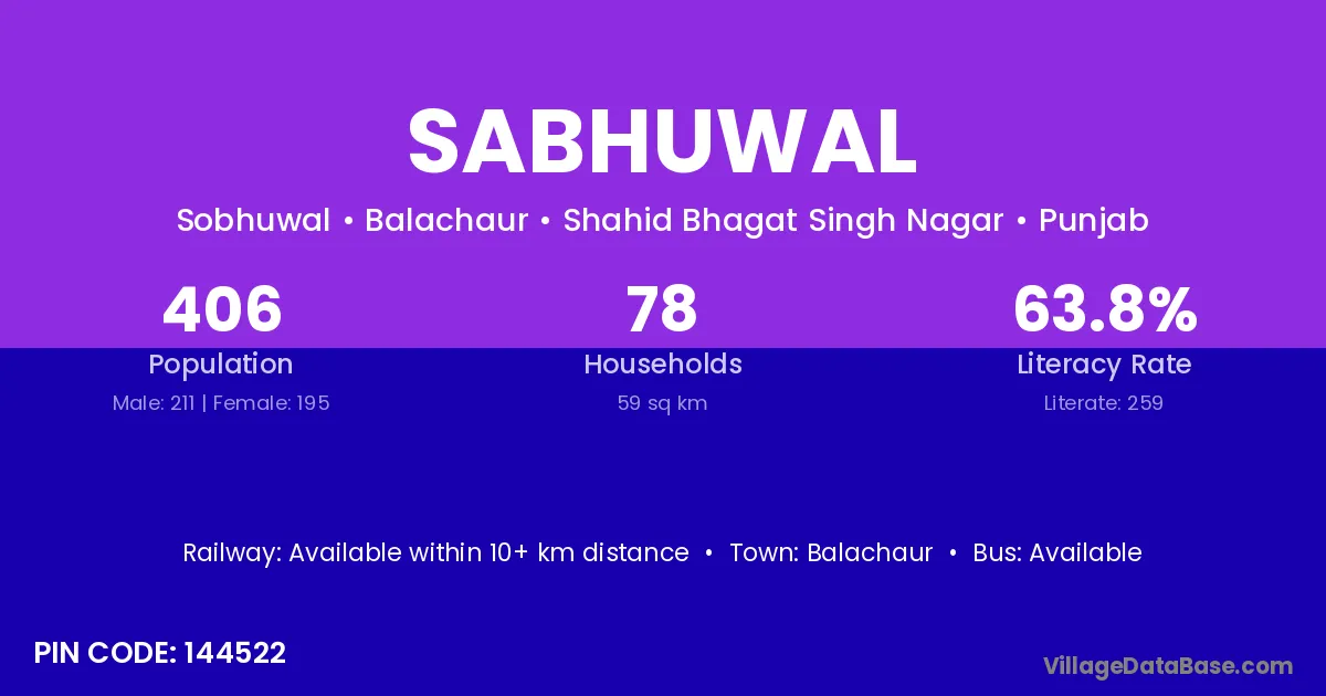 Sabhuwal village has a total population of 406 people, of which 211 are males and 195 are females.