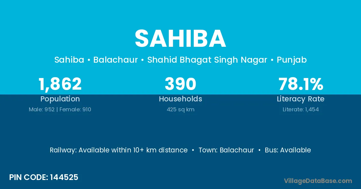Sahiba village has a total population of 1,862 people, of which 952 are males and 910 are females.