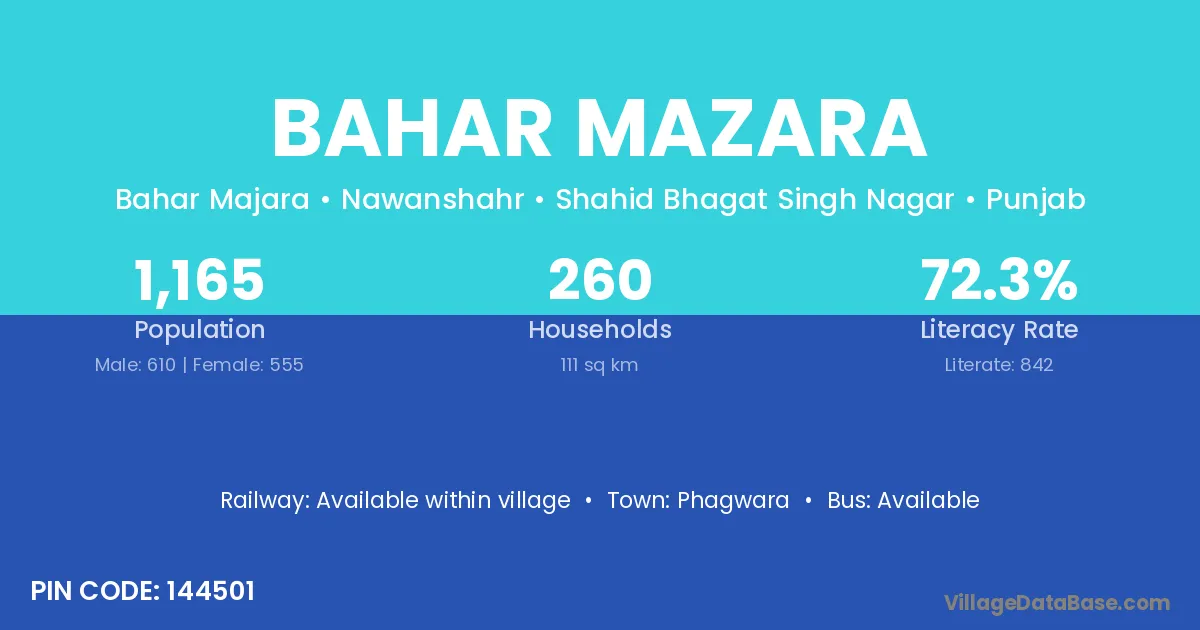 Bahar Mazara village has a total population of 1,165 people, of which 610 are males and 555 are females.
