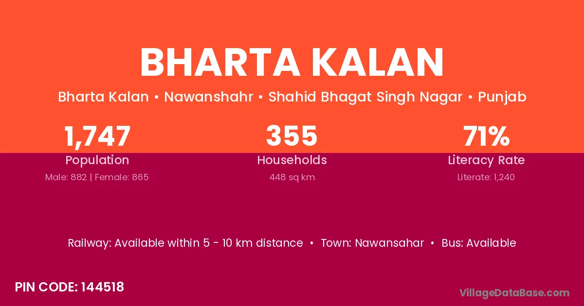 Bharta Kalan village has a total population of 1,747 people, of which 882 are males and 865 are females.