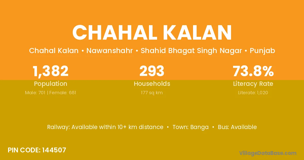 Chahal Kalan village has a total population of 1,382 people, of which 701 are males and 681 are females.