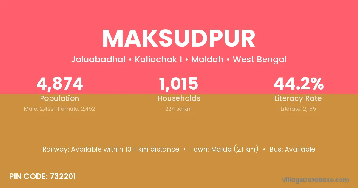 The literacy rate of Maksudpur village is 79.38%. Male literacy stands at 82.97% and female literacy at 75.68%.