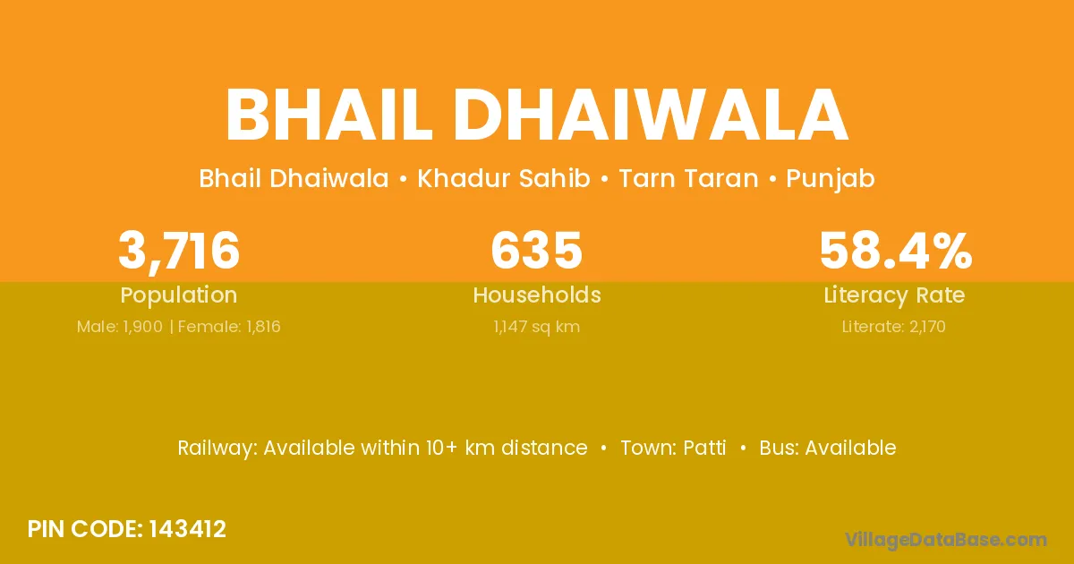 Bhail Dhaiwala village has a total population of 3,716 people, of which 1,900 are males and 1,816 are females.
