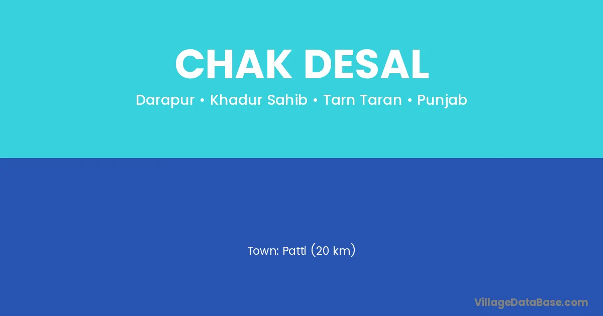 Patti (20 km) is the nearest town to Chak Desal village for major economic activities and is located approximately 20 km away.