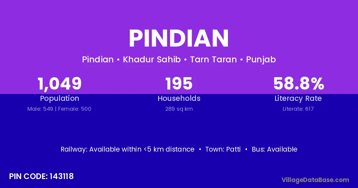 According to Census 2011 information, the village code of Pindian village is 143118.