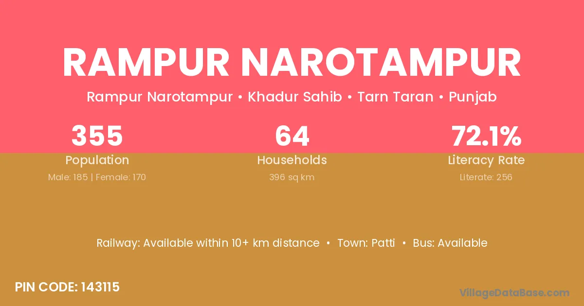 Rampur Narotampur village has a total population of 355 people, of which 185 are males and 170 are females.