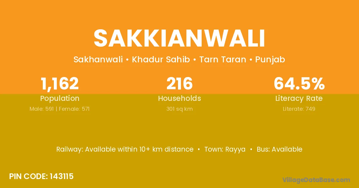 Sakkianwali village has a total population of 1,162 people, of which 591 are males and 571 are females.