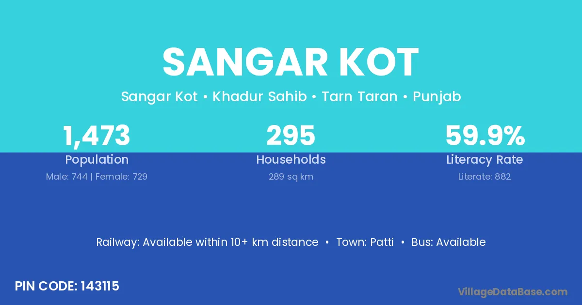 Sangar Kot village has a total population of 1,473 people, of which 744 are males and 729 are females.