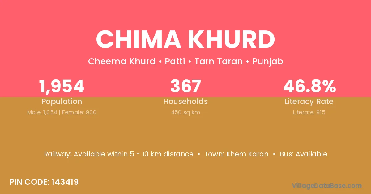 Chima Khurd village has a total population of 1,954 people, of which 1,054 are males and 900 are females.