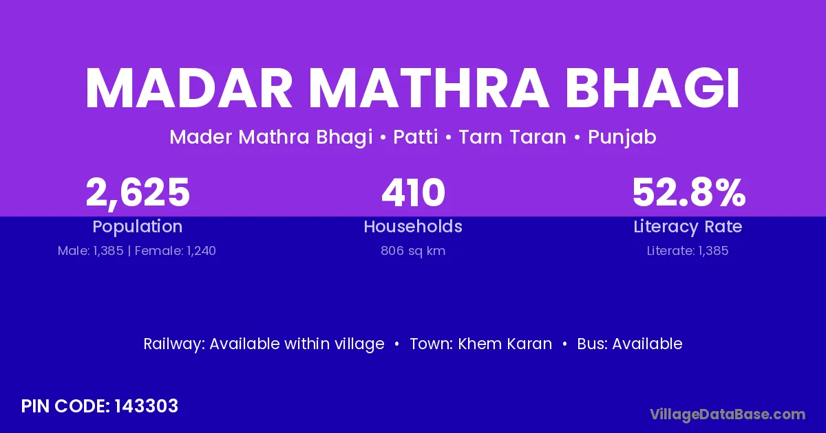 Madar Mathra Bhagi village has a total population of 2,625 people, of which 1,385 are males and 1,240 are females.