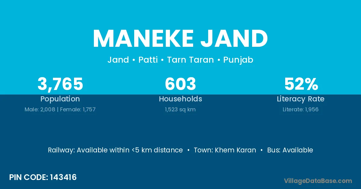 According to Census 2011 information, the village code of Maneke Jand village is 143416.