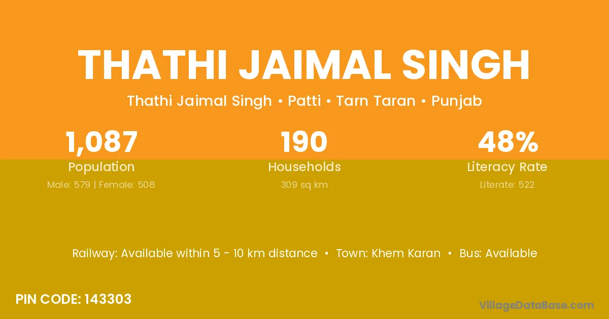 Thathi Jaimal Singh village has a total population of 1,087 people, of which 579 are males and 508 are females.