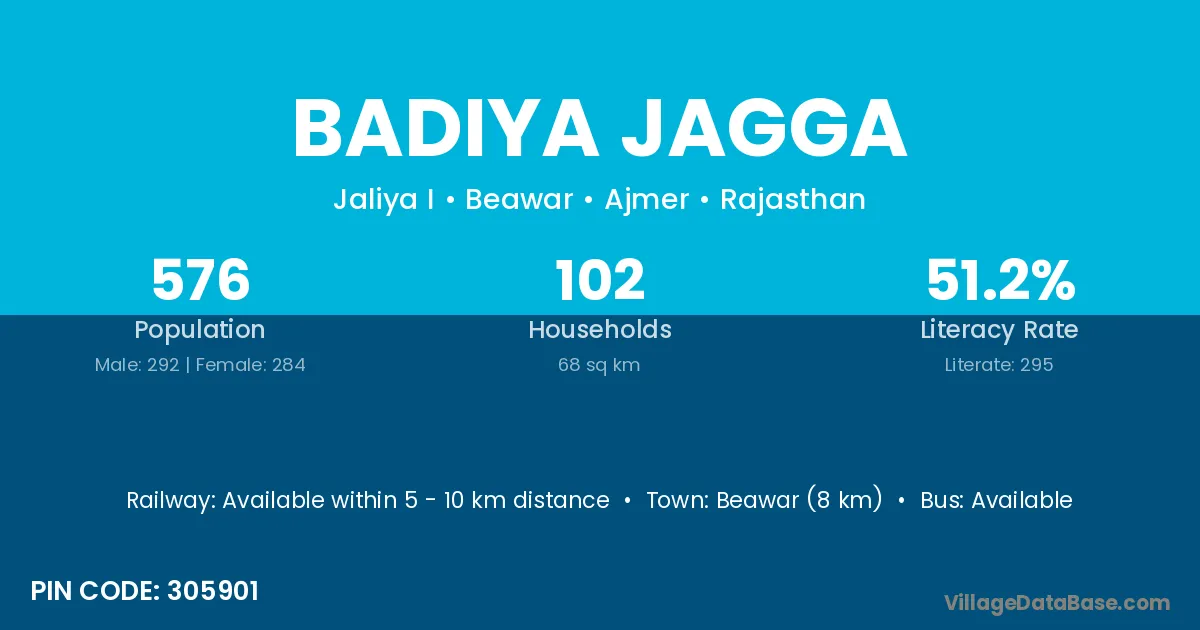 Beawar (8 km) is the nearest town to Badiya Jagga village for major economic activities and is located approximately 8 km away.