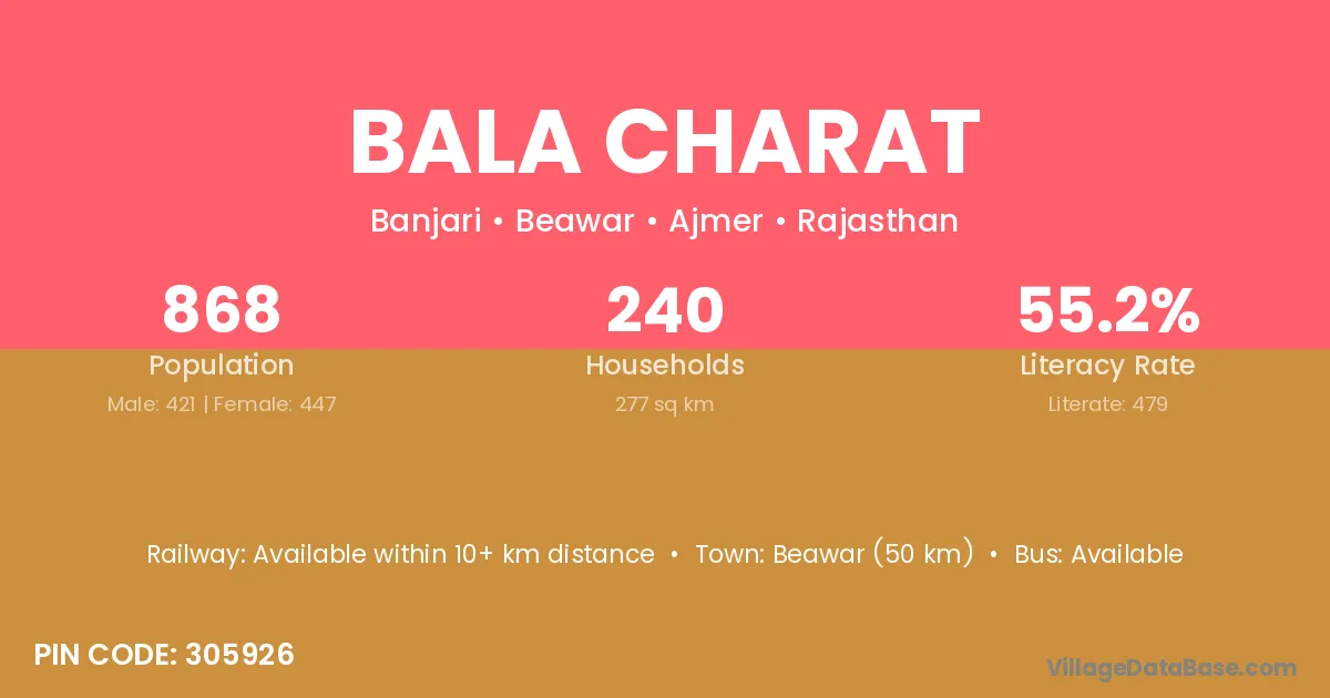 Beawar (50 km) is the nearest town to Bala Charat village for major economic activities and is located approximately 50 km away.