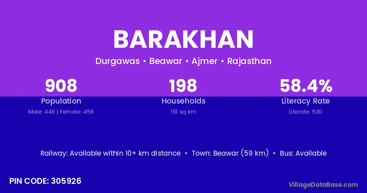 Beawar (59 km) is the nearest town to Barakhan village for major economic activities and is located approximately 59 km away.