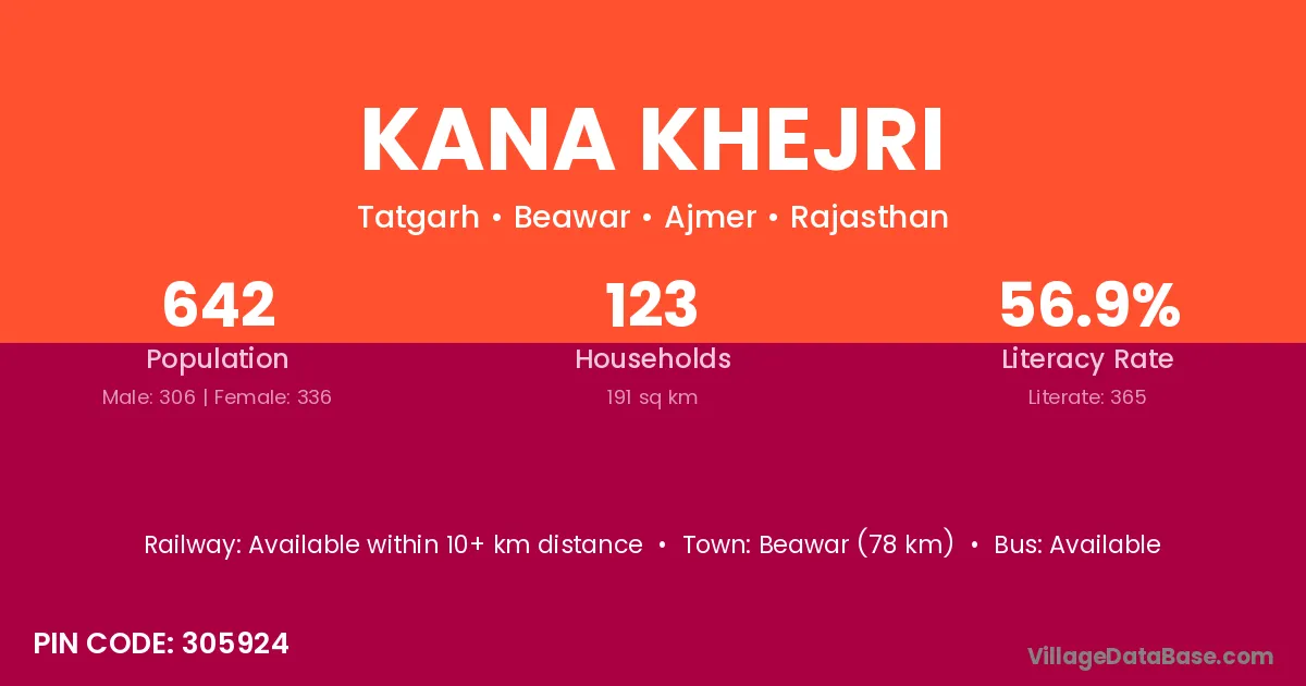 Beawar (78 km) is the nearest town to Kana Khejri village for major economic activities and is located approximately 78 km away.