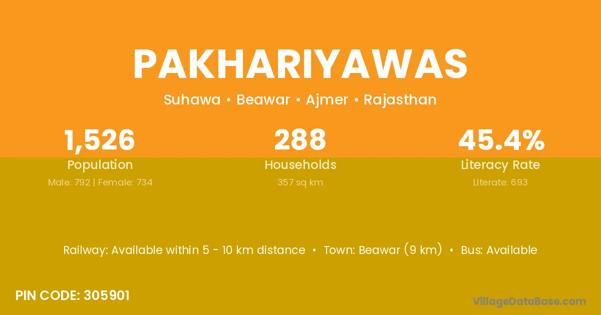 Beawar (9 km) is the nearest town to Pakhariyawas village for major economic activities and is located approximately 9 km away.