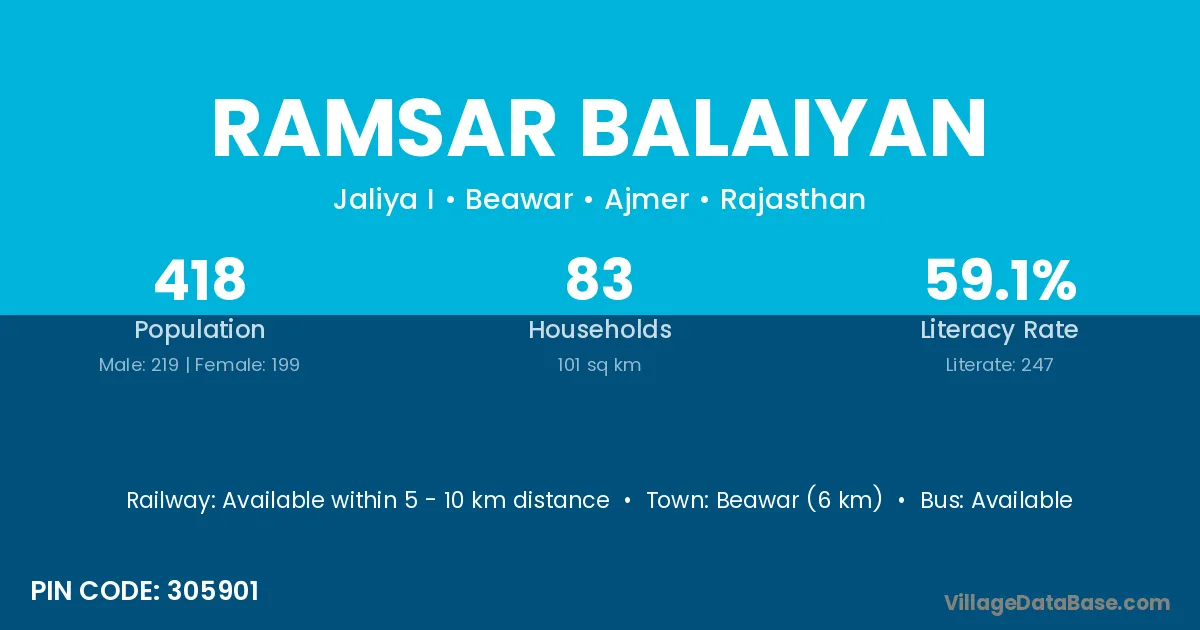 Beawar (6 km) is the nearest town to Ramsar Balaiyan village for major economic activities and is located approximately 6 km away.