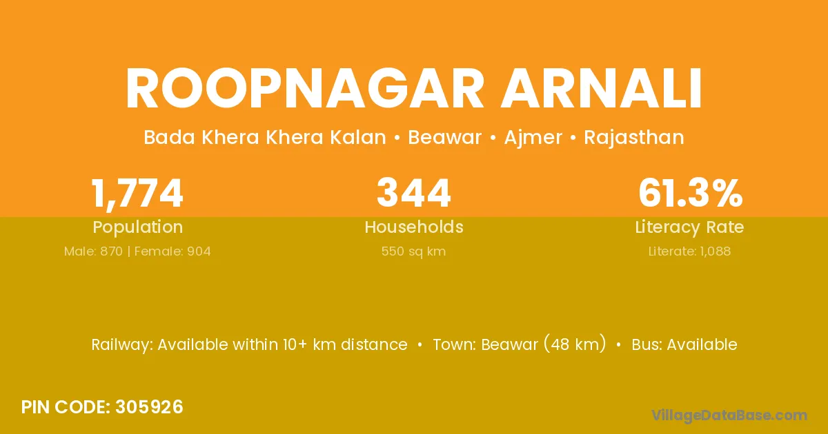 Beawar (48 km) is the nearest town to Roopnagar Arnali village for major economic activities and is located approximately 48 km away.