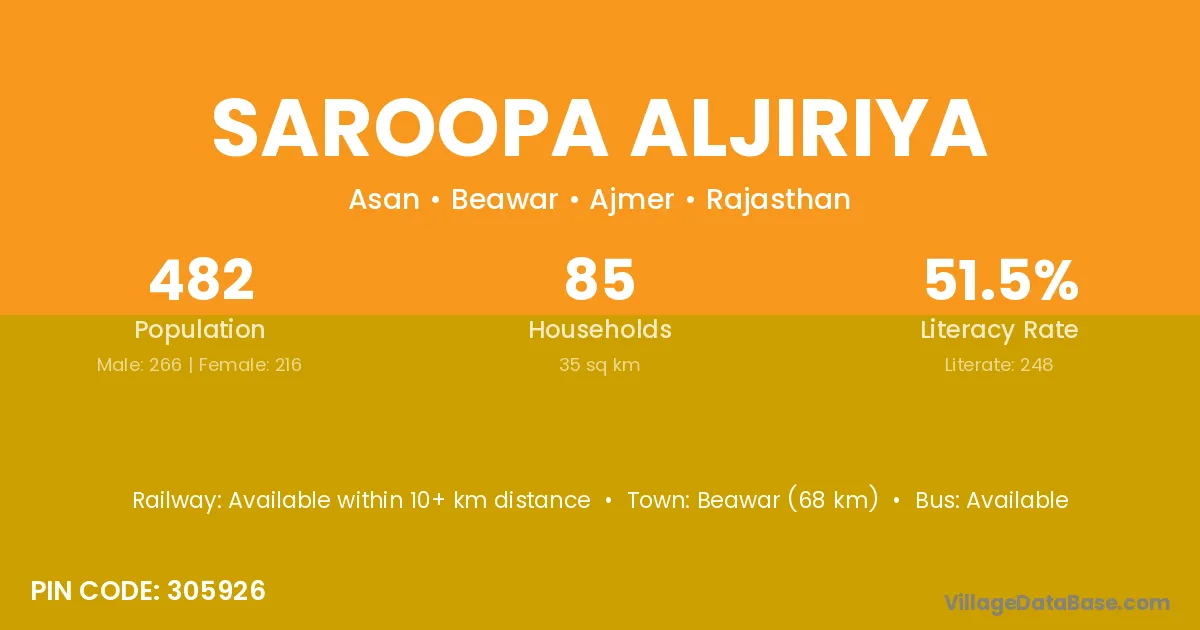 Beawar (68 km) is the nearest town to Saroopa Aljiriya village for major economic activities and is located approximately 68 km away.