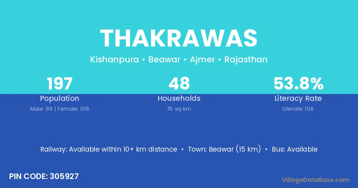 Beawar (15 km) is the nearest town to Thakrawas village for major economic activities and is located approximately 15 km away.