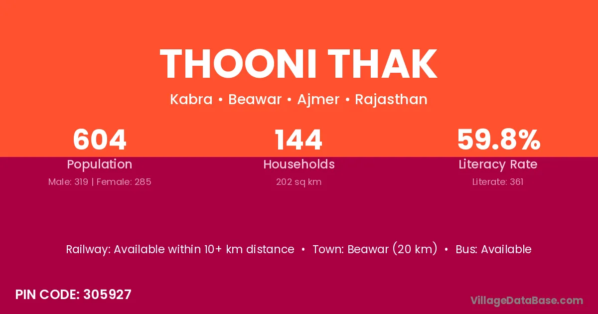 Beawar (20 km) is the nearest town to Thooni Thak village for major economic activities and is located approximately 20 km away.