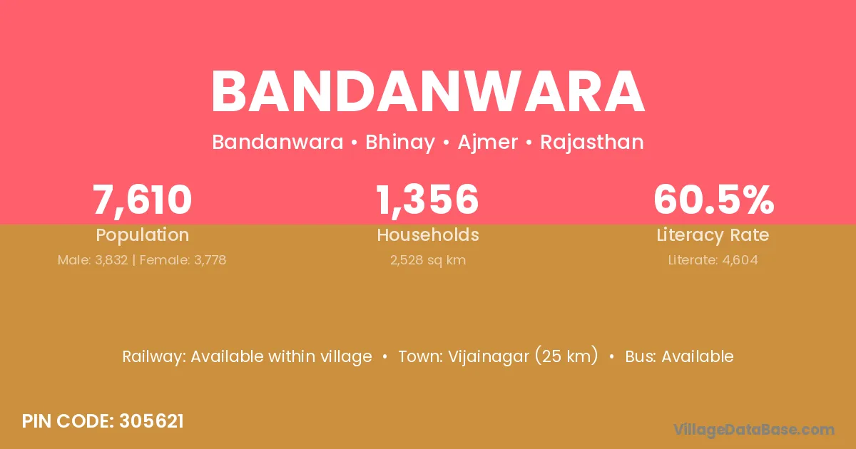 Vijainagar (25 km) is the nearest town to Bandanwara village for major economic activities and is located approximately 25 km away.