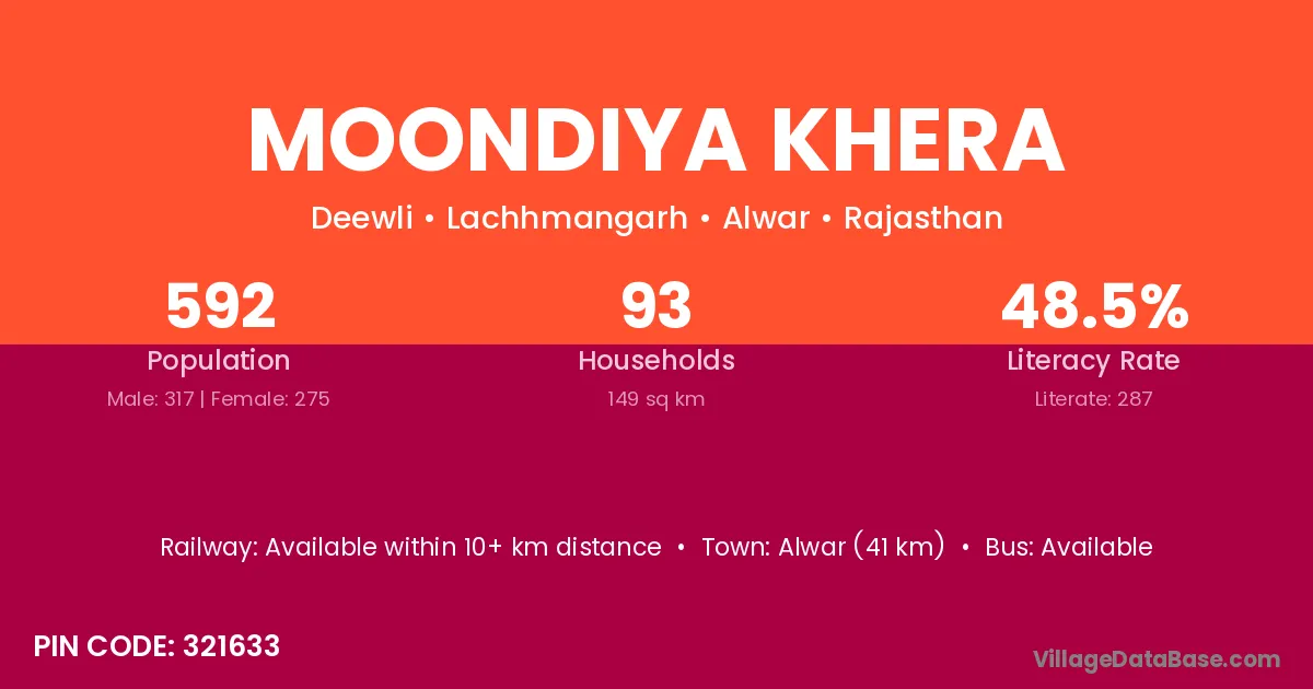 Ajmer (81 km) is the nearest town to Moondiya Khera village for major economic activities and is located approximately 81 km away.