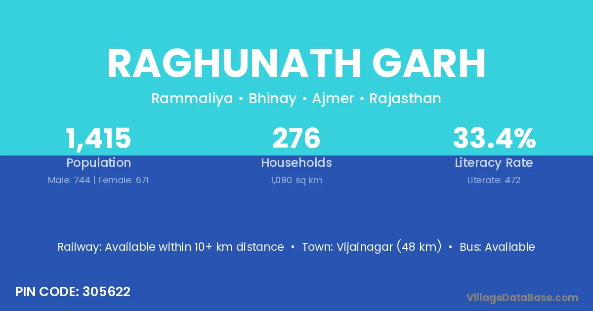 Vijainagar (48 km) is the nearest town to Raghunath Garh village for major economic activities and is located approximately 48 km away.