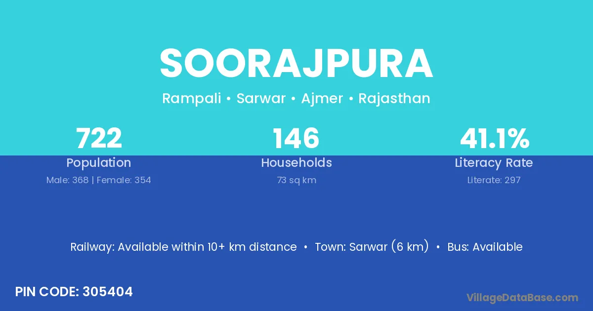 Vijainagar (29 km) is the nearest town to Soorajpura village for major economic activities and is located approximately 29 km away.