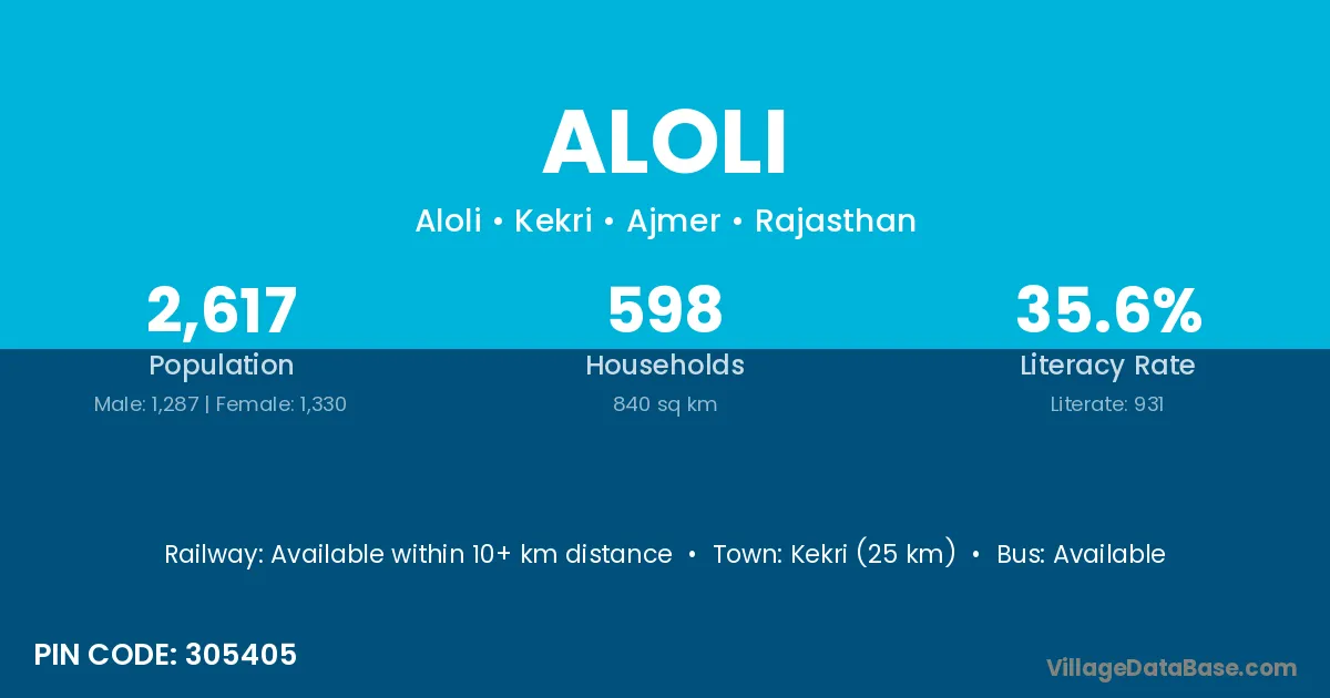 Kekri (25 km) is the nearest town to Aloli village for major economic activities and is located approximately 25 km away.