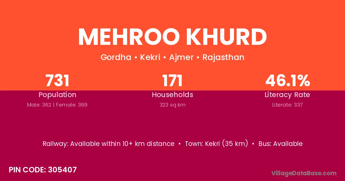 Kekri (35 km) is the nearest town to Mehroo Khurd village for major economic activities and is located approximately 35 km away.