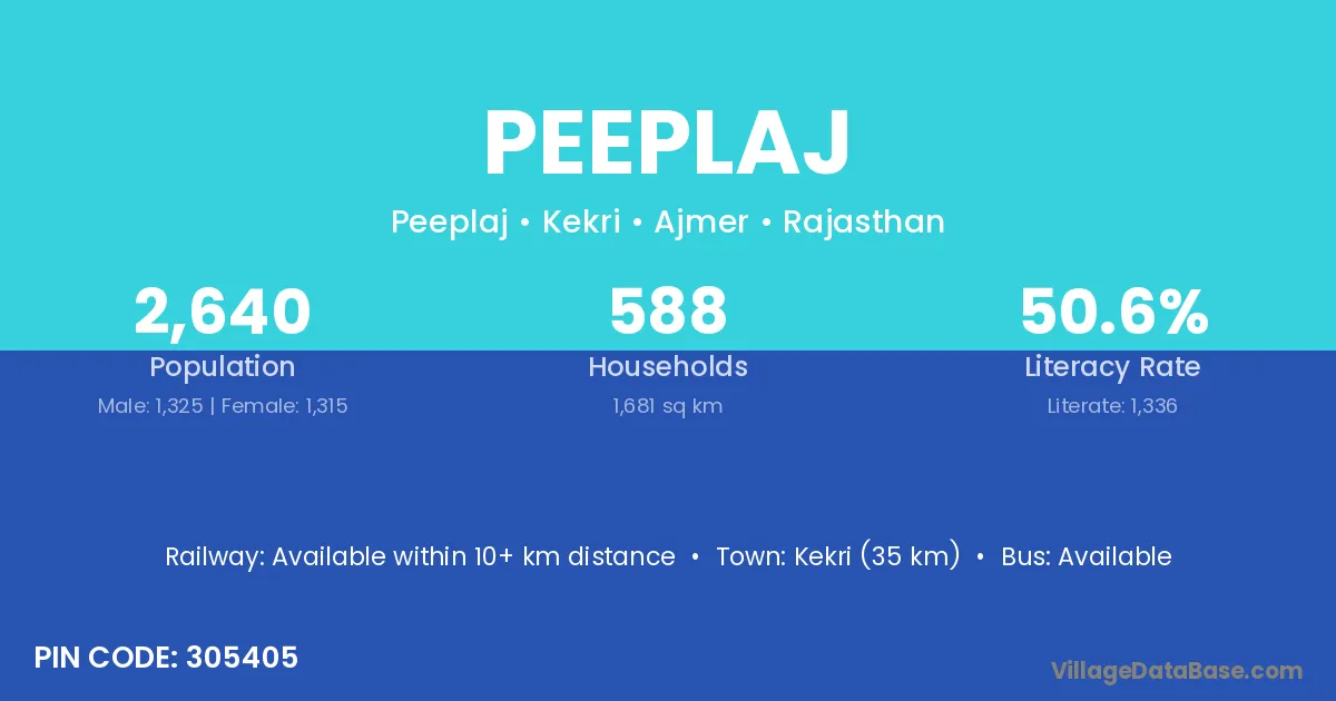 Kekri (35 km) is the nearest town to Peeplaj village for major economic activities and is located approximately 35 km away.
