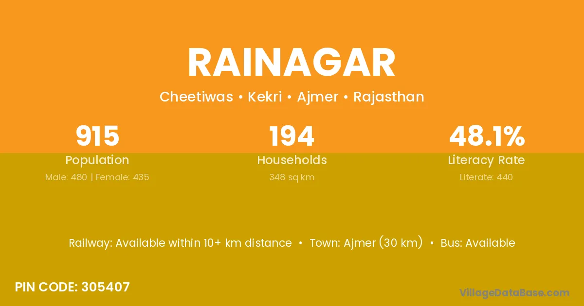 Ajmer (30 km) is the nearest town to Rainagar village for major economic activities and is located approximately 30 km away.