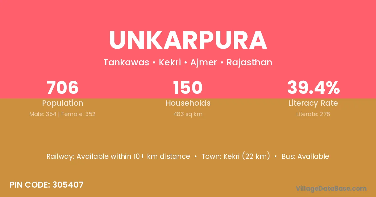 Kekri (22 km) is the nearest town to Unkarpura village for major economic activities and is located approximately 22 km away.