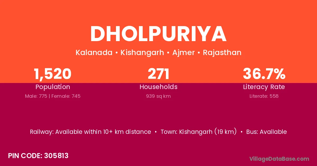 Kishangarh (19 km) is the nearest town to Dholpuriya village for major economic activities and is located approximately 19 km away.