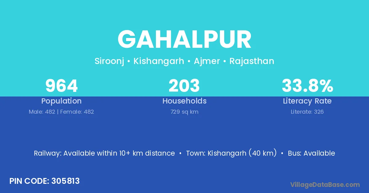 Kishangarh (40 km) is the nearest town to Gahalpur village for major economic activities and is located approximately 40 km away.