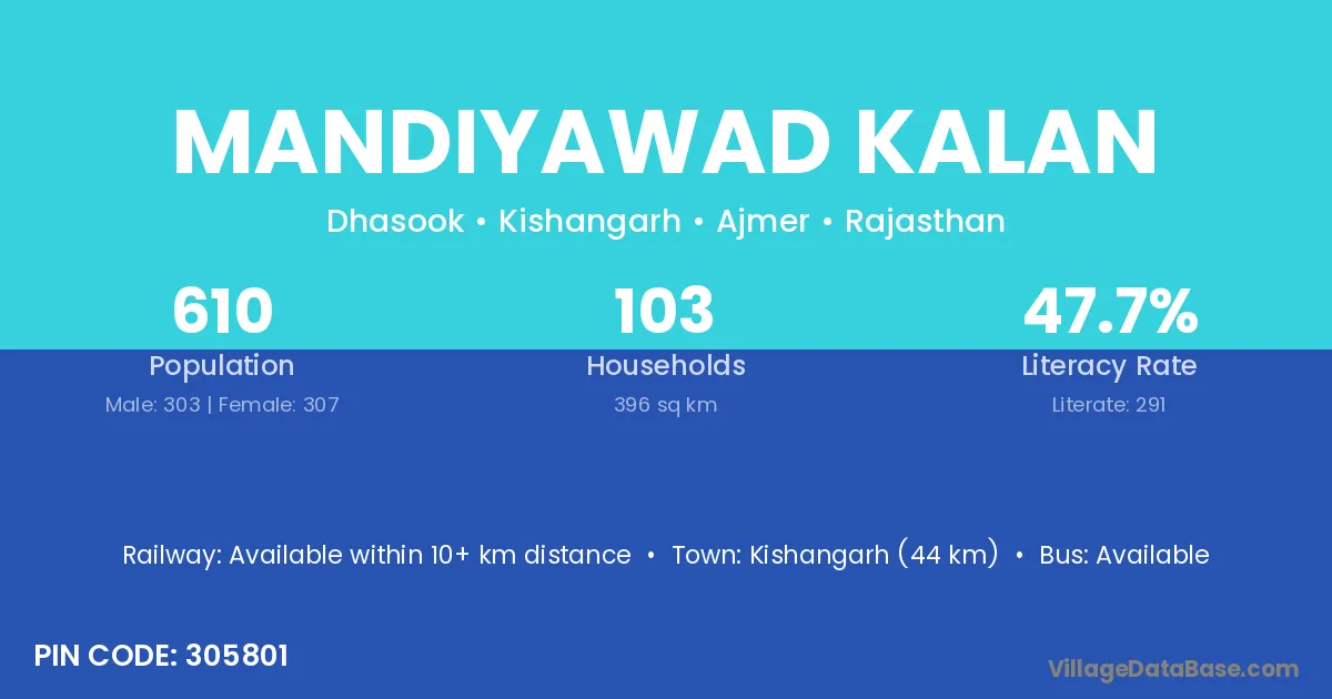 Kishangarh (44 km) is the nearest town to Mandiyawad Kalan village for major economic activities and is located approximately 44 km away.