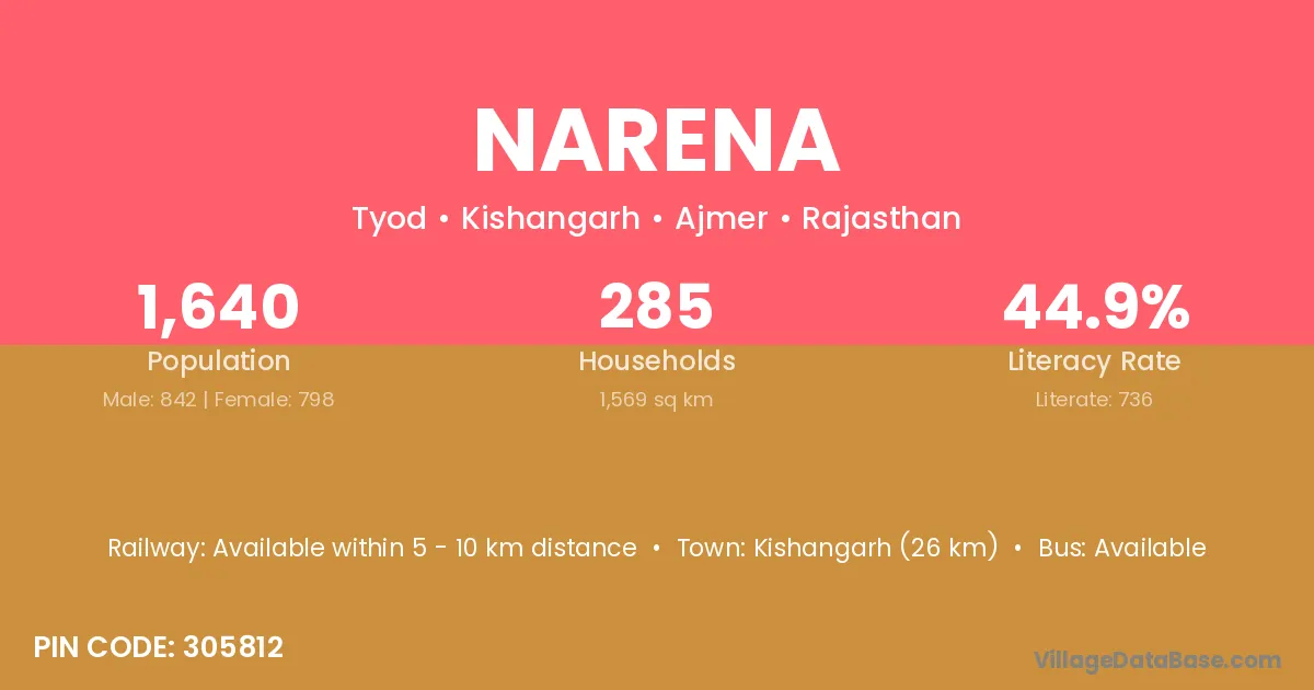 Kishangarh (26 km) is the nearest town to Narena village for major economic activities and is located approximately 26 km away.