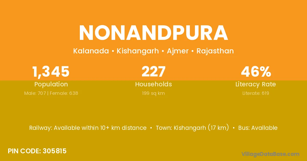 Kishangarh (17 km) is the nearest town to Nonandpura village for major economic activities and is located approximately 17 km away.