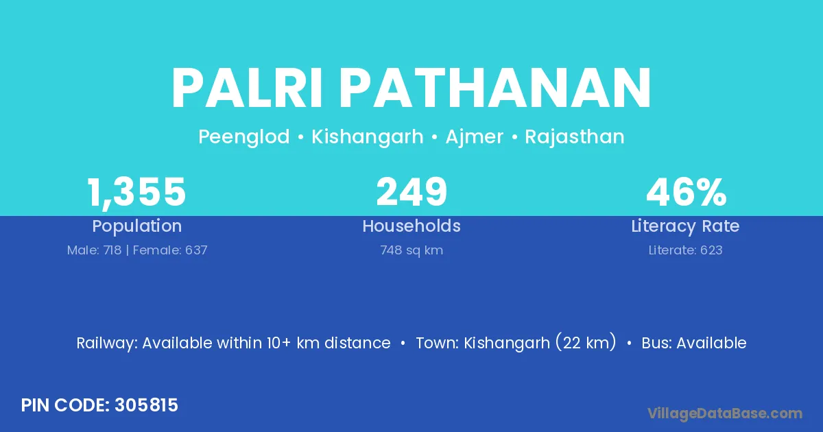Kishangarh (22 km) is the nearest town to Palri Pathanan village for major economic activities and is located approximately 22 km away.