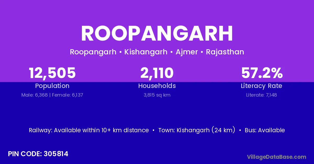 Kishangarh (24 km) is the nearest town to Roopangarh village for major economic activities and is located approximately 24 km away.