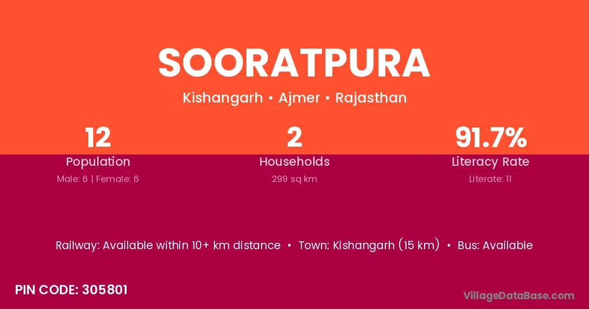 Sooratpura village has a total population of 12 people, of which 6 are males and 6 are females.